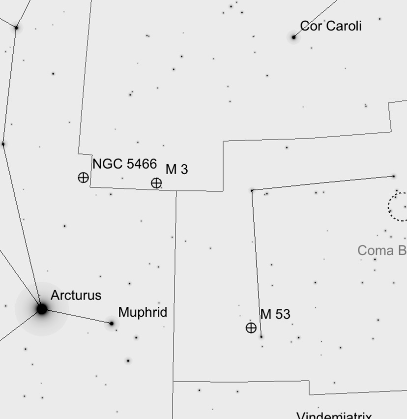 NGC 5466 lies five degree east of M3 in Boötes. It’s somewhat challenging, but I have seen it with 3 inch aperture.