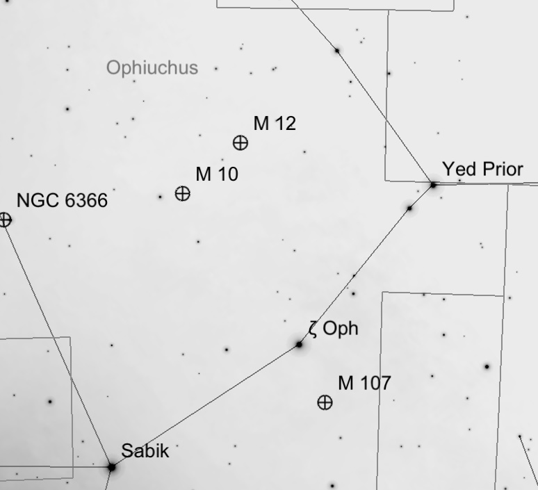 M107 is easy to find just under 3 degrees south west of bright Zeta Ophiuchi.