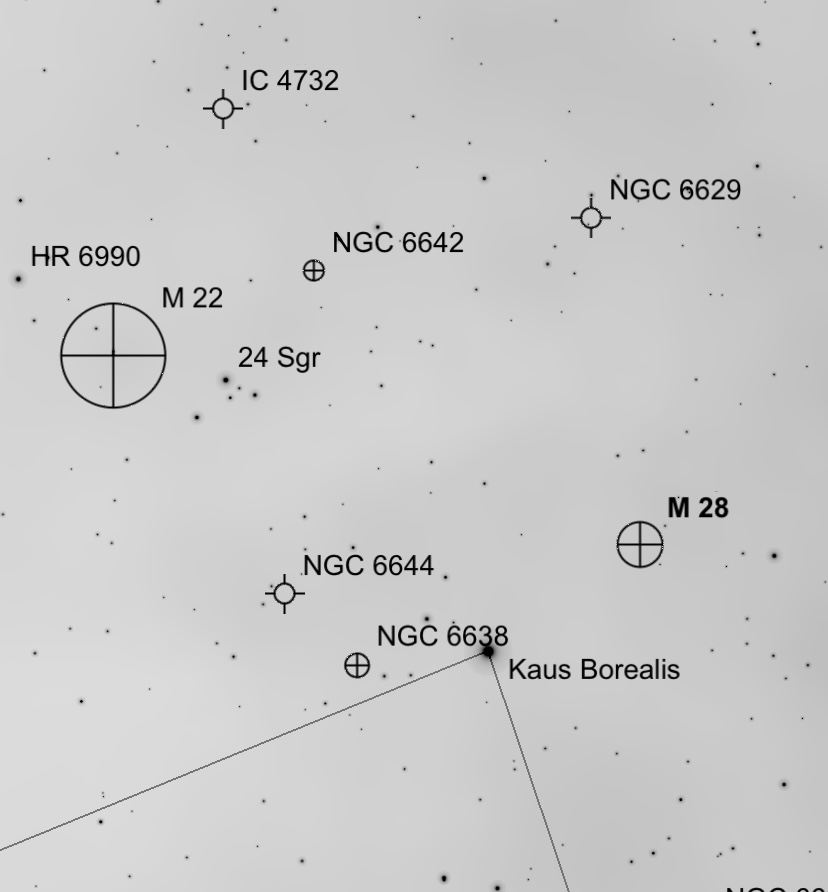Sagittarius is chock full of globulars. M28 is only one degree northeast of Kaus Borealis, allowing easy comparison with M22.