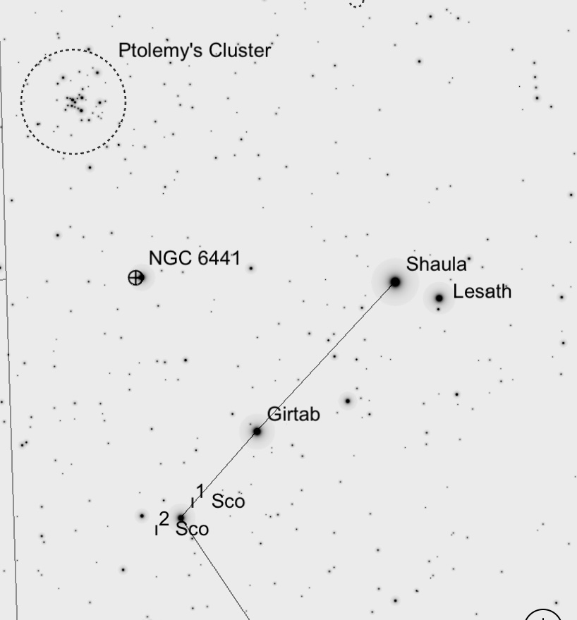 Lastly a globular that’s easy to observe but a little challenging due to its far southerly declination. If you can see the bright stinger star of Scorpius, just over three degrees east is 3rd magnitude orange star G Scorpii. Touching it on the east is bright globular NGC 6441.